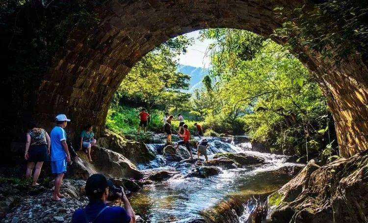 古石拱桥下戏水的搭客。
